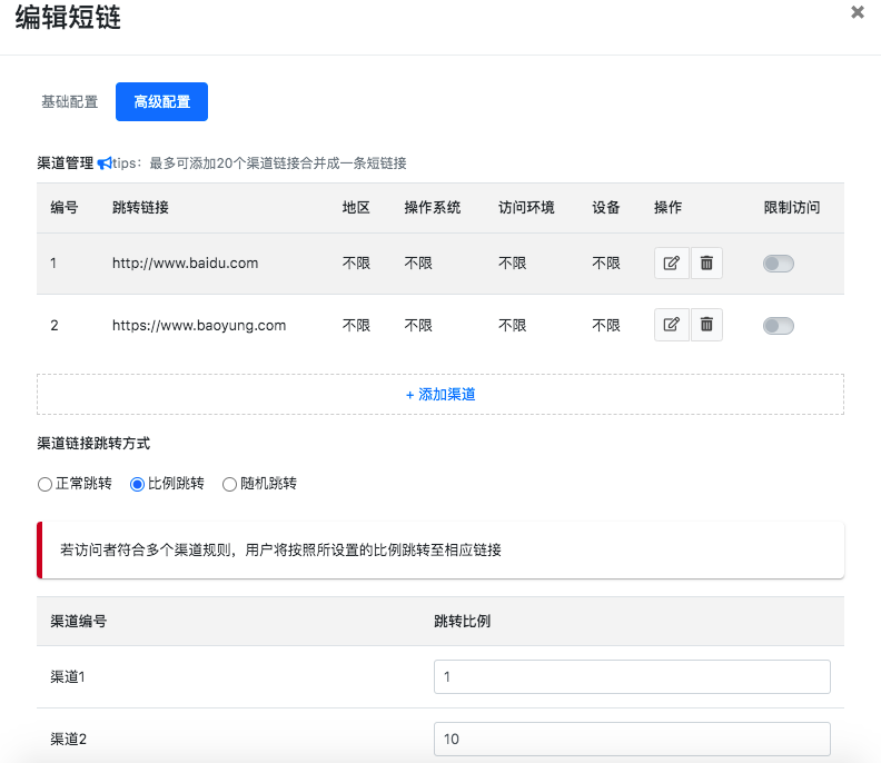 选择添加渠道,来新增多个链接,基础配置中的链接为默认链接