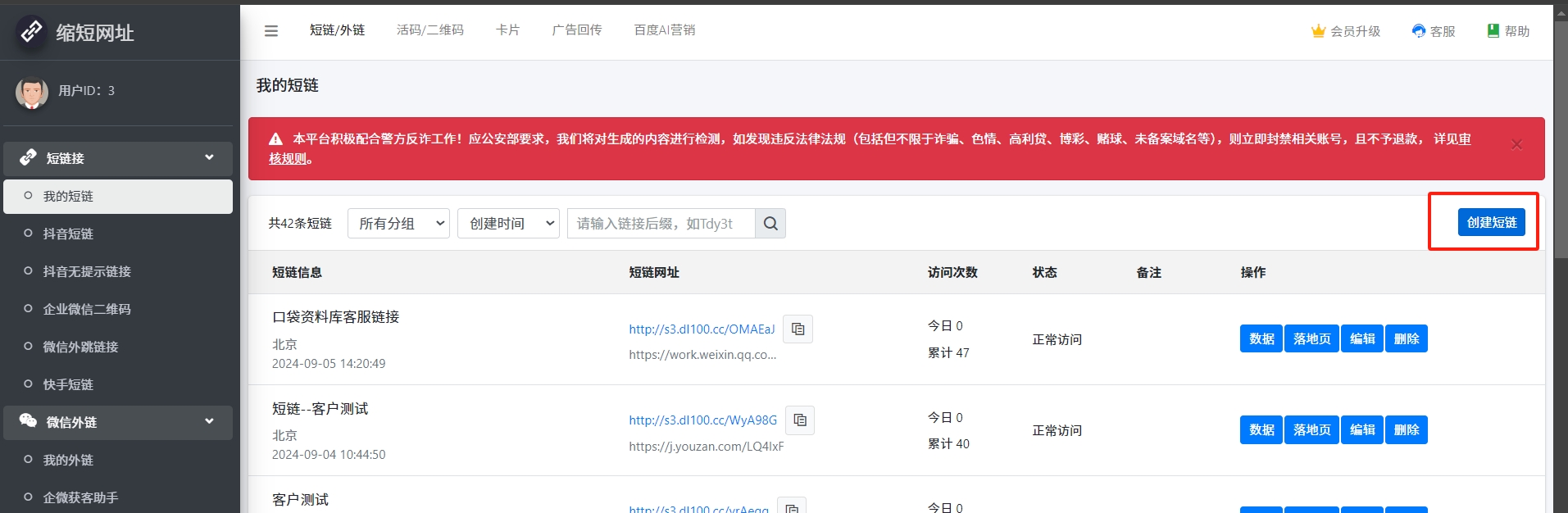 - 点击【新建短链】按钮