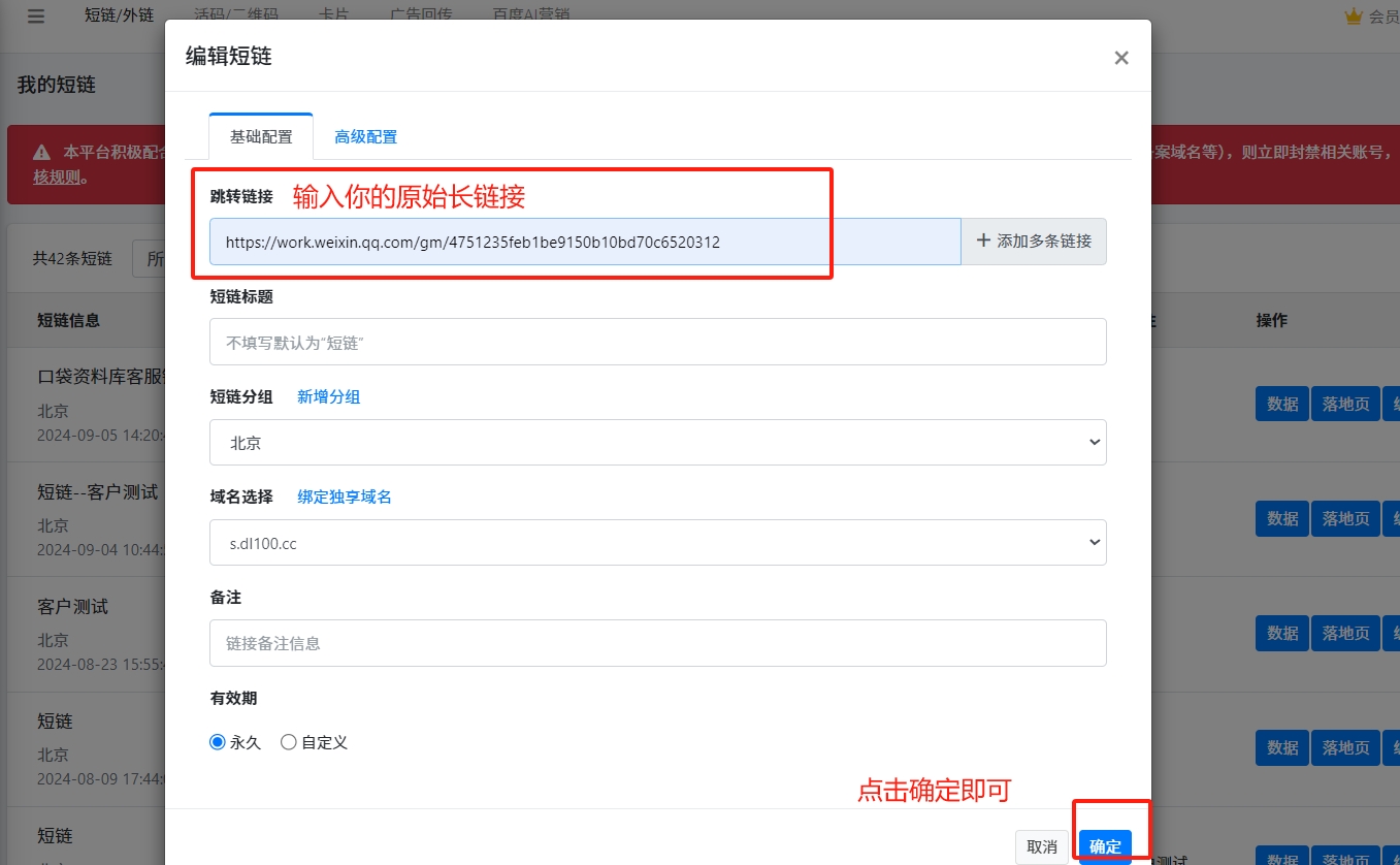 - 输入你的原始长连接,点击【确定】按钮生成短链