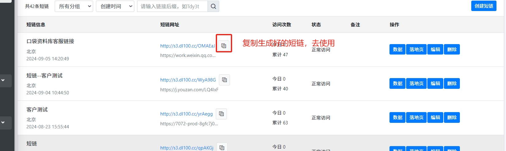 - 点击复制按钮,复制短链接