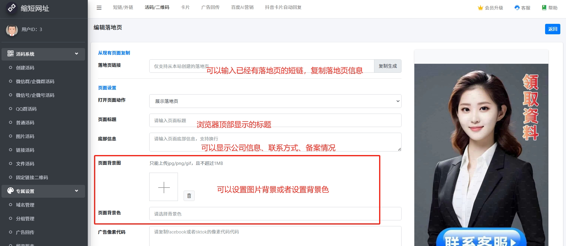 2.落地页信息设置