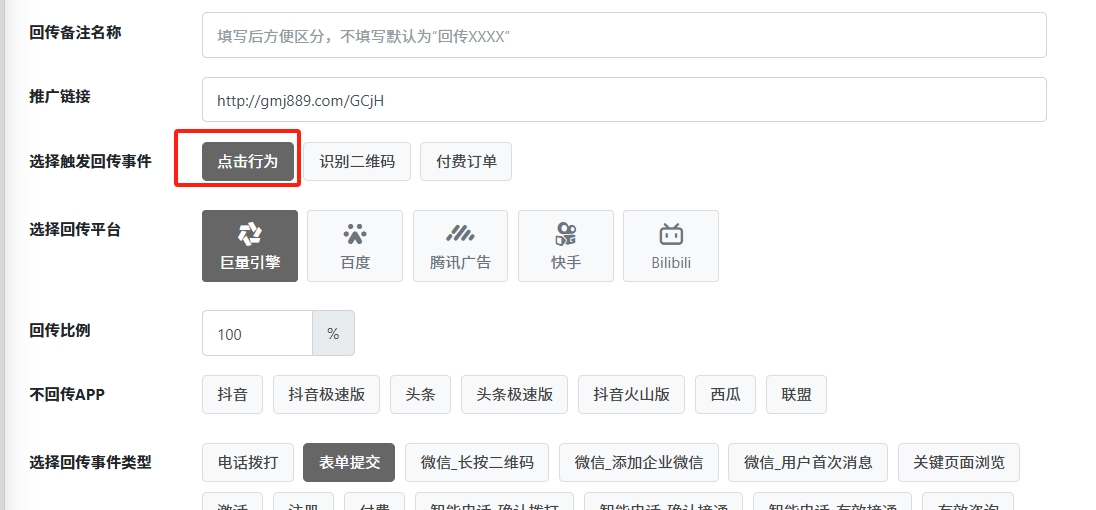 在广告回传配置中,选择【点击行为】