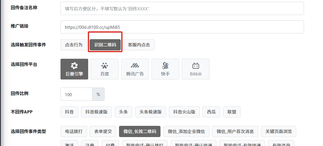 3.【识别二维码】事件广告回传设置,目前支持如下2种模式(优码和草料模式不支持)