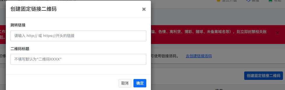 - 点击【创建固定链接二维码】,输入链接和名称,确定即可