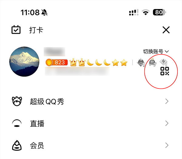 第一步:打开手机QQ的,点击左上角个人头像打开设置界面,然后点击个人资料最右侧的二维码图标