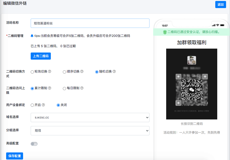 你可以为每个二维码定制分流策略:设置不同有效期、扫码量;设置不同的跳转方式